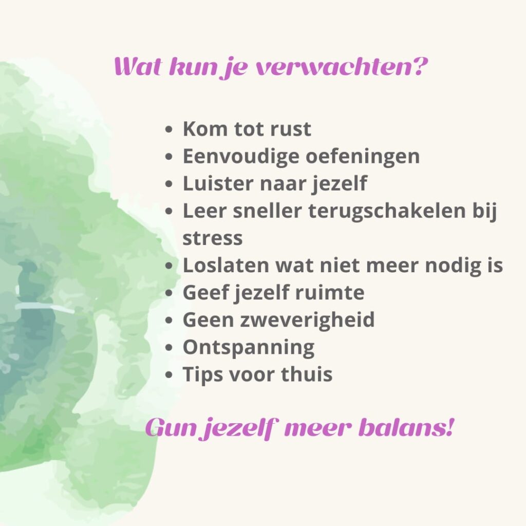 Workshop Workshop "Even toe aan wat rust?" Op zaterdag 18 oktober 2025 gaf ik samen met Marjanne ter Heurne van Yoga en zo Aalten de workshop “Even toe aan wat rust?”Tijdens deze morgen nemen we je mee in verschillende technieken en oefeningen om zelf tot rust te komen. Een ochtendje ME-Time voor jou!Het was een mooie en waardevolle ochtend waarin deelnemers tips en achtergrond informatie hebben gekregen.Had je er graag bij willen zijn? Op zaterdag 7 februari 2026 geven we deze ochtend nogmaals. Wil je erbij zij? Laat het ons weten. Waardebon Wil je iemand verrassen en ook laten ervaren wat kinesiologie voor hem/haar kan betekenen? Geef een kennismakingsbehandeling kado.Vraag naar de mogelijkheden!