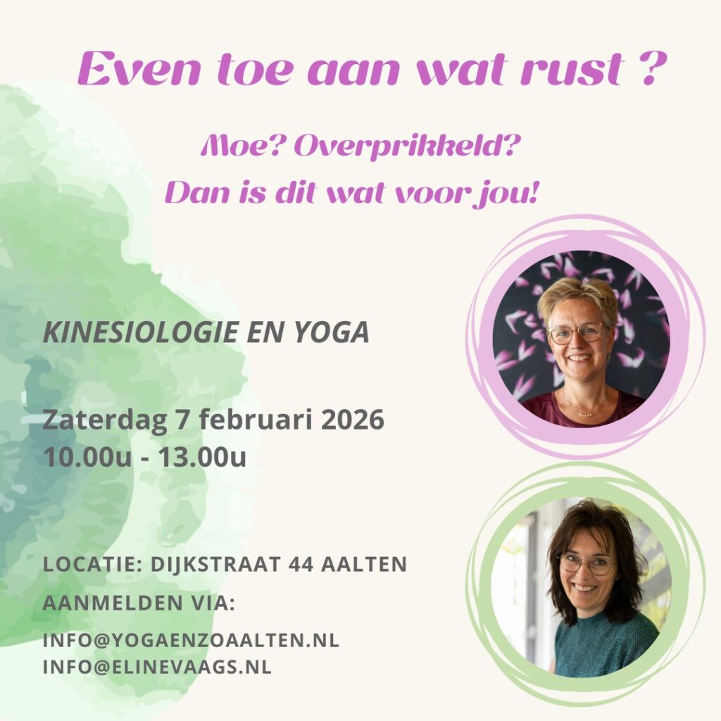 Workshop Workshop "Even toe aan wat rust?" Op zaterdag 18 oktober 2025 gaf ik samen met Marjanne ter Heurne van Yoga en zo Aalten de workshop “Even toe aan wat rust?” Tijdens deze morgen nemen we je mee in verschillende technieken en oefeningen om zelf tot rust te komen. Een ochtendje ME-Time voor jou! Het was een mooie en waardevolle ochtend waarin deelnemers tips en achtergrond informatie hebben gekregen. Had je er graag bij willen zijn? Op zaterdag 7 februari 2026 geven we deze ochtend nogmaals. Maar dan met de insteek: Moe? Overprikkeld? Wil je erbij zij? Laat het ons weten. Waardebon Wil je iemand verrassen en ook laten ervaren wat kinesiologie voor hem/haar kan betekenen? Geef een kennismakingsbehandeling kado.Vraag naar de mogelijkheden!